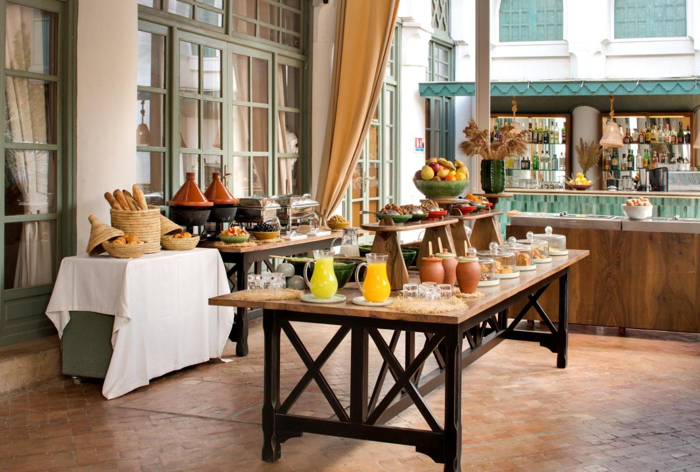 Patio Side Double Room. These spacious rooms are traditionally decorated and open onto a private patio with trees and a fountain. They include free Wi-Fi, satellite TV, a minibar and a bathroom with slippers, bathrobes and a bath or rain shower. Guests also receive a plate of Moroccan pastries and mineral water upon arrival. This room can accommodate children aged less than 4 years old for free. Extra beds are charged 50€ for children between 4 and 11 years old and 80€ for adults. ;