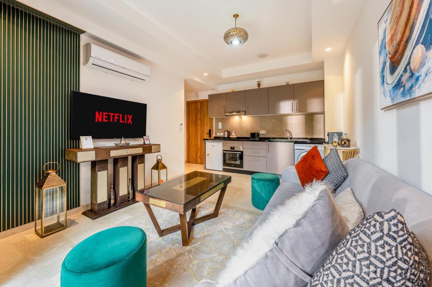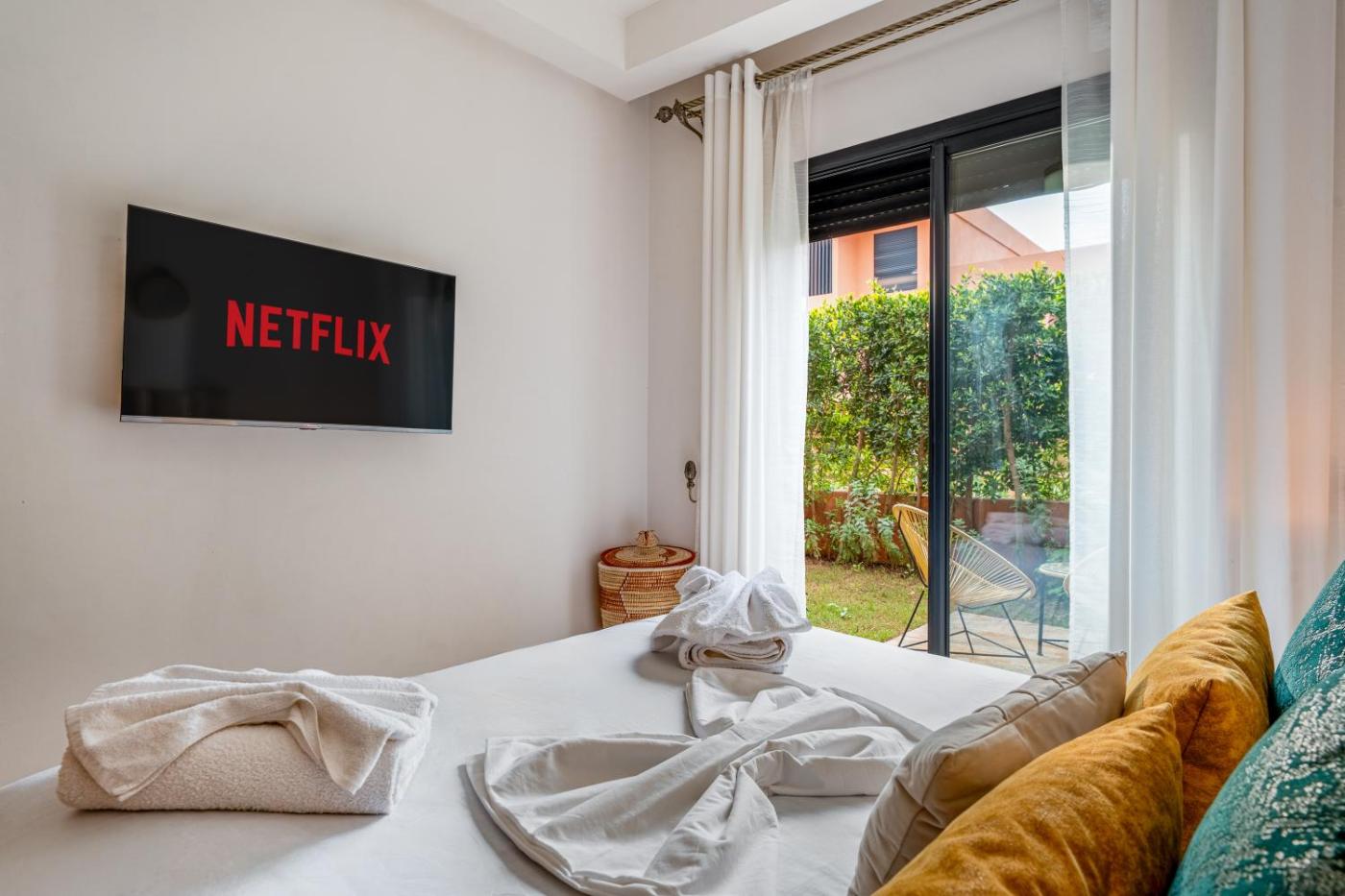 One-Bedroom Apartment. Boasting 1 bedroom, this spacious apartment has 1 bathroom with a bath or a shower, a seating area and terraceyou can relax. The well-fitted kitchen has a stovetop, a refrigerator, kitchenware and an oven. The air-conditioned apartment features a flat-screen TV with streaming services, a washing machine, a private entrance, a tea and coffee maker as well as garden views. The unit offers 2 beds.