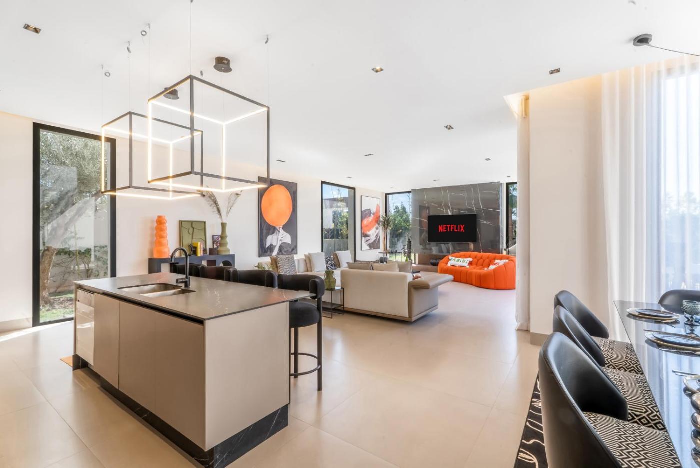 The spacious villa is equipped with 3 bedrooms, a fully equipped kitchen with a dishwasher and an oven, and 5 bathrooms with a bidet, bathrobes and a washing machine. The unit is soundproofed and includes a tiled floors as well as a fireplace. This villa is allergy-free and non-smoking.