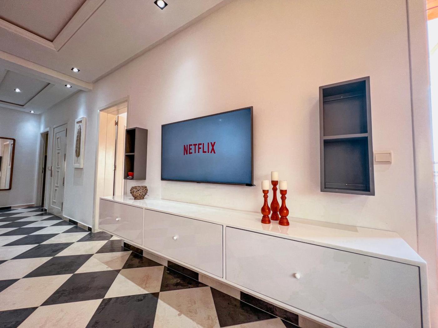 The spacious apartment is equipped with 2 bedrooms, 1 bathroom, bed linen, towels, a flat-screen TV with streaming services, a dining area, a fully equipped kitchen, and a terrace with sea views. Guests can take in the views of the mountain from the balcony, which also has outdoor furniture. At the apartment, there is a dressing room for guests to change in.
